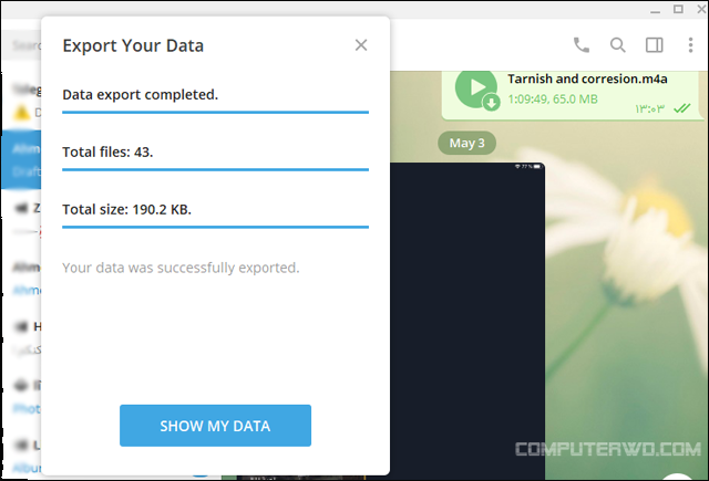 بعد ذلك ستظهر لك نافذة جديدة توضح لك تفاصيل التصدير والتي تتضمن العدد الإجمالي للملفات المصدَرة، والحجم الإجمالي أيضاً.كما يمكنك الضغط على Show My Data ليأخذك مباشرة إلى المجلد الذي تم حفظ الملفات المصدَرة بداخله.