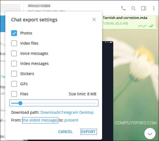 بعد الضغط على (Export Chat History) تظهر لك نافذة جديدة يمكنك من خلالها إختيار الملفات التي تود تصديرها بجانب النصوص. يمكنك تصدير الصور، ومقاطع الفيديو، والرسائل الصوتية، والملصقات وملفات GIF وكل ما تحتوية الدردشة من وسائط، يمكنك أيضاً تعيين الحد الأدنى والأقصى لسجل الدردشة، حيث يمكنك تصدير دردشة كاملة بحجم 1500 ميغابايت كحد أقصى، وسيتم تعيين الحد البالغ لحجم الملف 8 ميغابايت بصورة إفتراضية. ويمكنك أيضاً ترتيب الرسائل الظاهرة في الملف من الأقدم إلى الأحدث أو العكس. بعد إتمام كل هذه الإعدادات ستقوم بالضغط على (Export).
